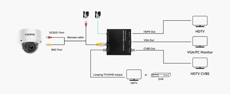 - HDTVI LOOPOUT - to record continuously in a DVR or XVR, switchable AHD/HDTVI/HDCVI/CVBS otuput.